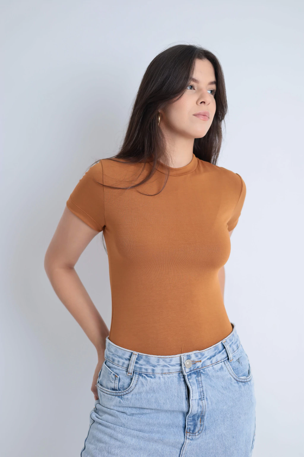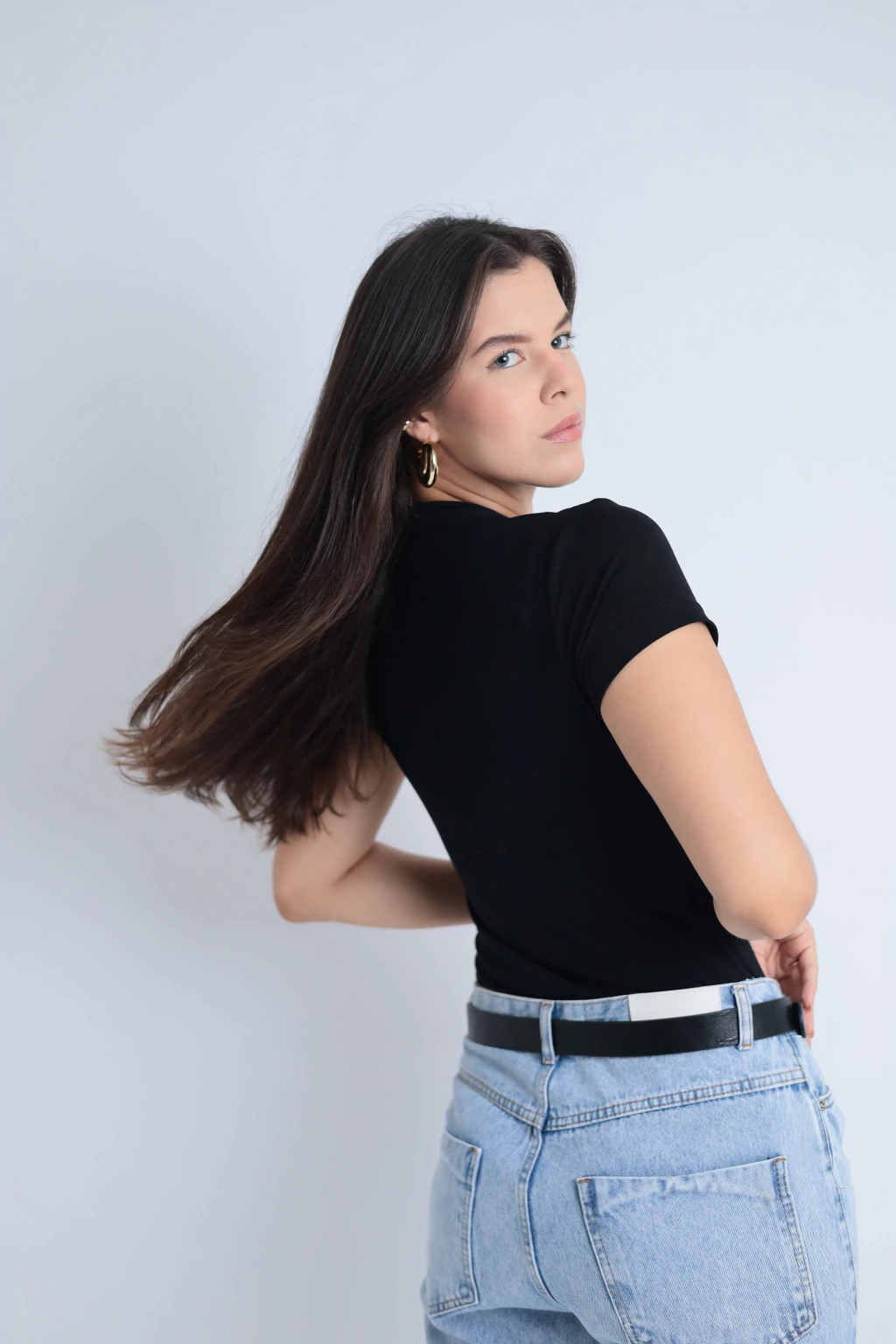 A BABY LOOK CLARA É AQUELE ESSENCIAL QUE FAZ TODA DIFERENÇA. MODELAGEM JUSTINHA, QUE VALORIZA SEM APERTAR, TECIDO LEVE E CONFORTÁVEL, COM TOQUE MACIO QUE ABRAÇA O CORPO. GOLA CARECA E ACABAMENTO MINIMALISTA, PARA QUEM AMA UM BÁSICO COM PRESENÇA. VAI FÁCIL COM JEANS, ALFAIATARIA, SAIA OU ATÉ SOBREPOSIÇÃO — DO DIA PRO ROLÊ, SEM ERRO.